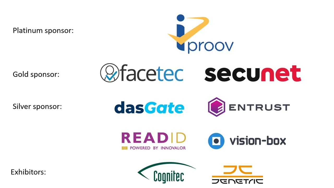 Many thanks to our sponsors: iProov, FaceTec, secunet, Entrust, InnoValor, Veridas, Vision-Box and thanks to our current exhibitors Jenetric and Cognitec for their valued support.